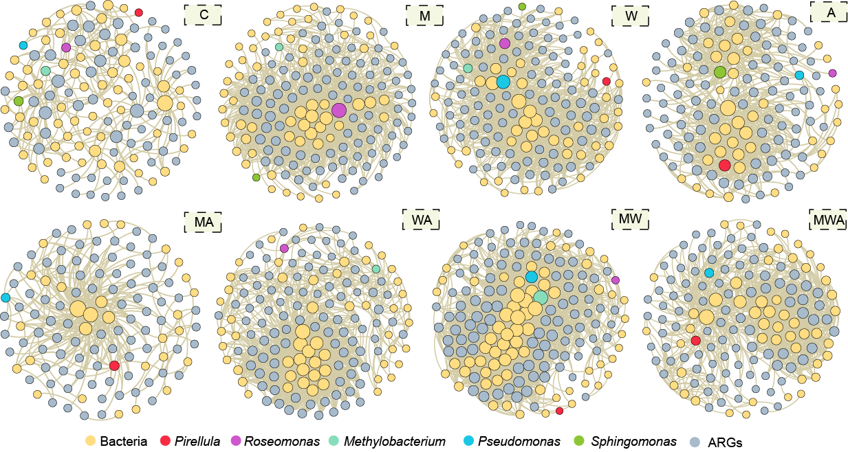 图1 不同处理下ARGs宿主菌-ARGs互作网络图